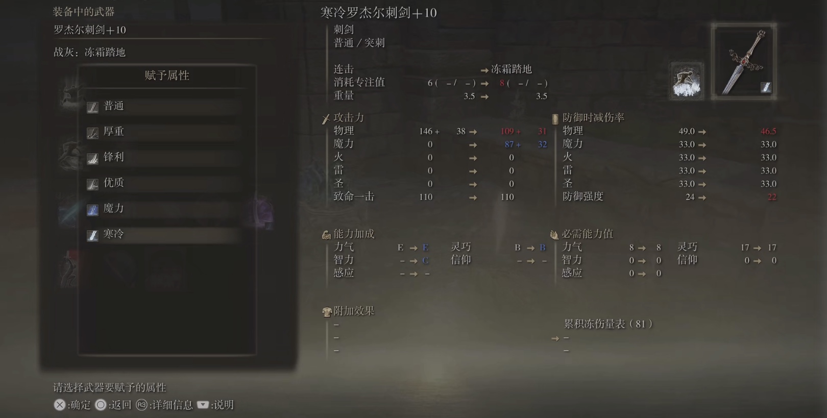 艾爾登法環冰霜踏地可以用羅傑爾刺劍。羅傑爾刺劍是魔法師羅傑爾的武器,是以細膩裝飾的優質刺劍;它需要擁有相當高的靈巧,才能揮舞自如;並且,羅傑爾刺劍的連續攻擊的表現不錯,使出連擊時動作有如流水,十分華麗,搭配冰霜踏地在近戰時會發揮出更強大的力量。