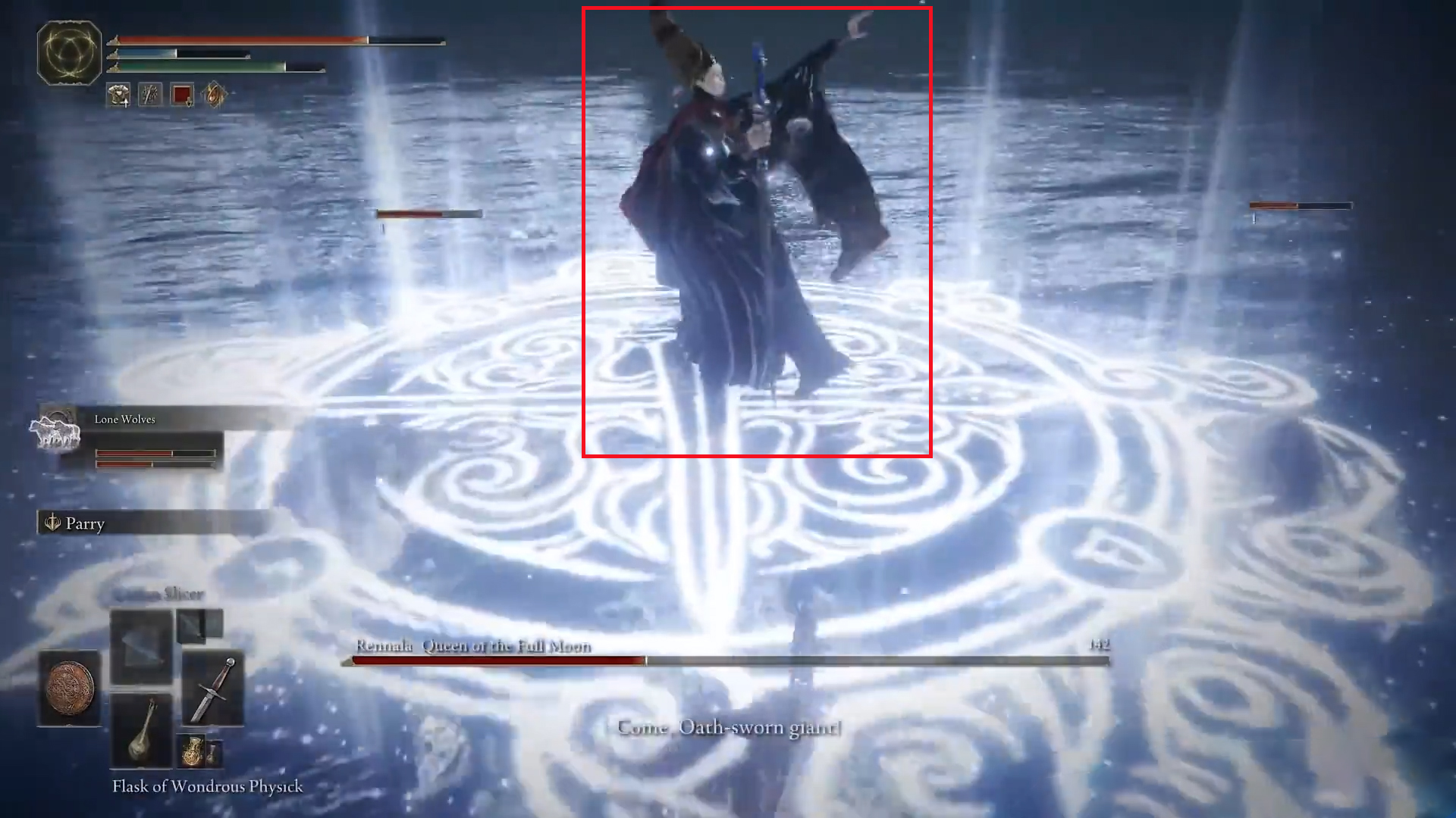 6.注意,剛進入二階段時不要做多餘動作,BOSS會立刻釋放激光,被打倒血量就見底了,所以一定要立刻向側方翻滾閃避。野狼靈魂會時不時打斷BOSS的攻擊,趁此機會攻擊她即可。