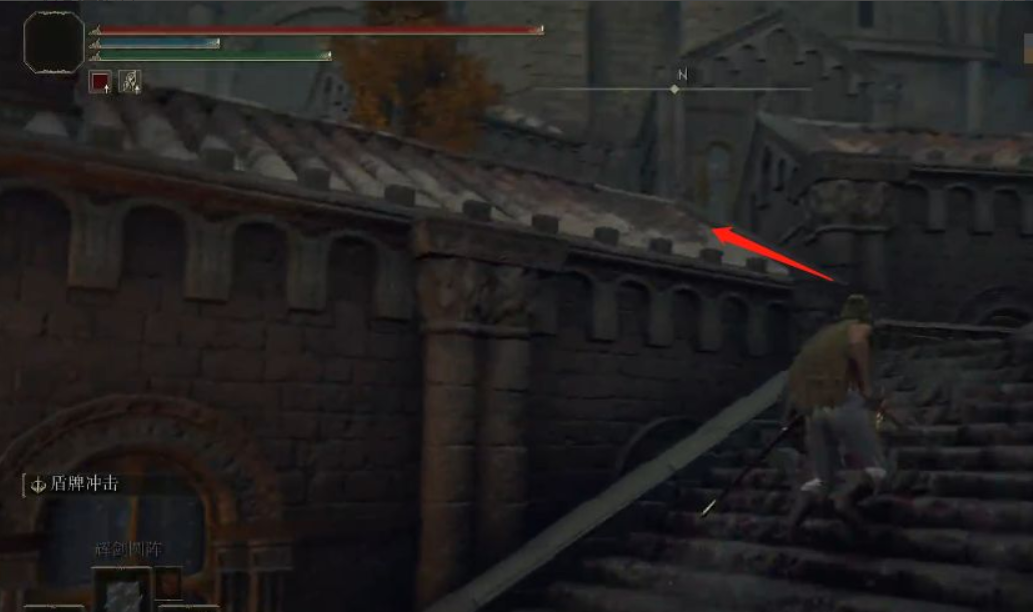 2、其次,傳送到地點後,來到階梯處,跳到左側的房頂上。