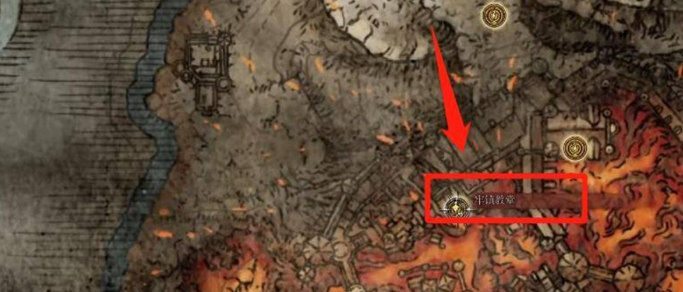 1、首先,我們進入遊戲,打開地圖,移動至下圖所示的牢鎮教堂位置;