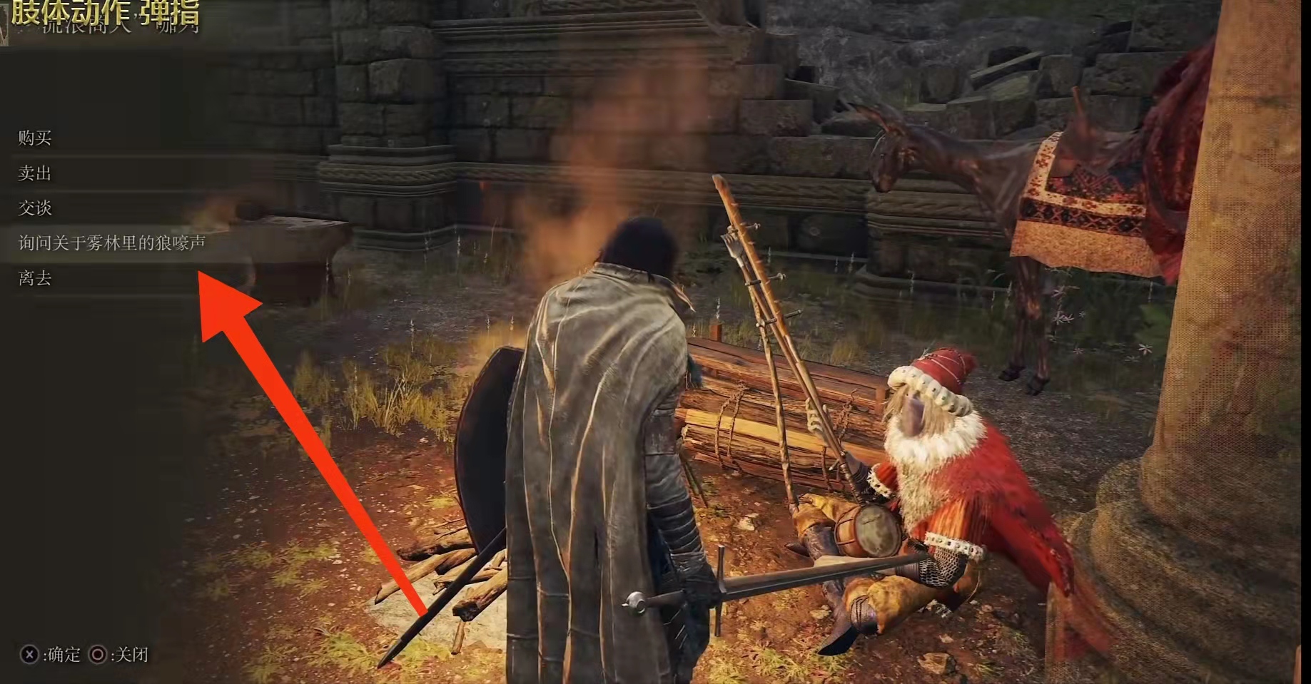 4、選擇與他交談,選擇點擊左側的詢問關於霧林里的狼嚎聲。