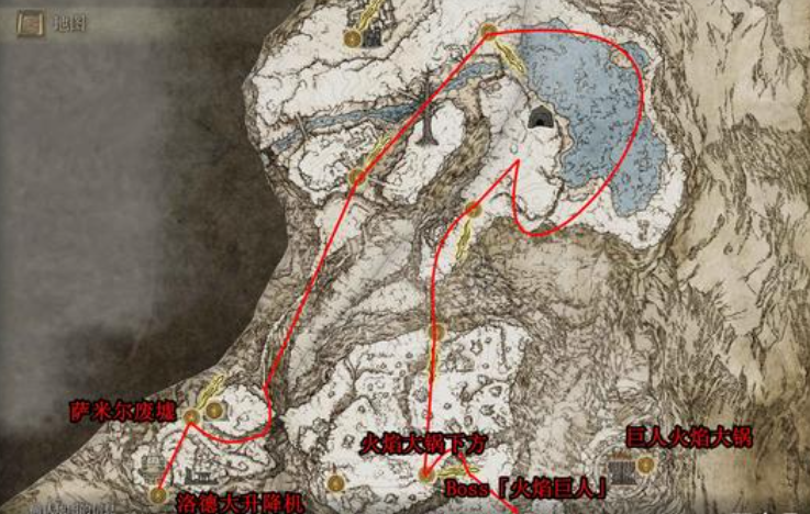 首頁 艾爾登法環 問答 艾爾登法環火焰大鍋怎麼去? 2022-07-29 1.來到禁域,繼續往東走,會來到洛德大升降機。2.在升降機前舉起符節,進入巨人山頂,沿著下圖的路線跑到賜福火焰大鍋下方,踩著鏈條進入東側,擊敗 Boss火焰巨人,然後來到賜福巨人火焰大鍋。