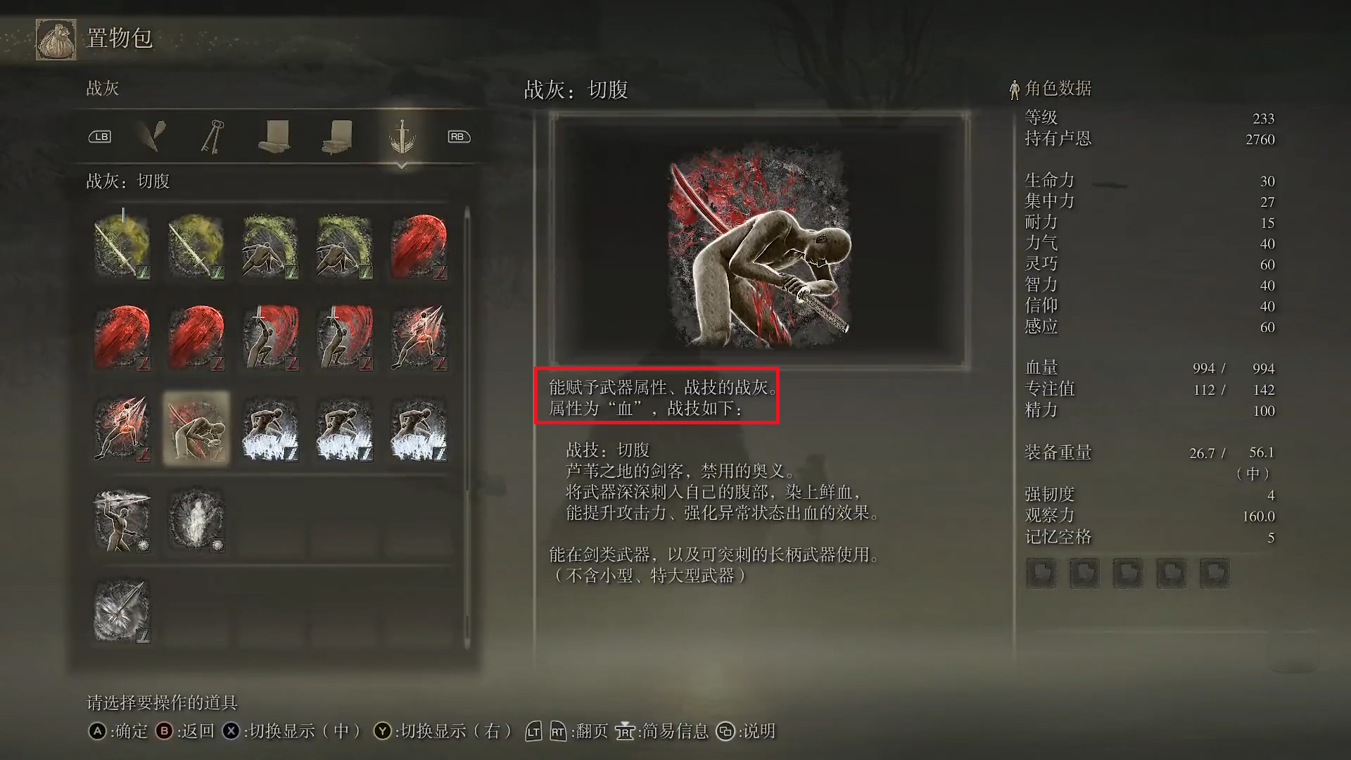 首頁 艾爾登法環 問答 老頭環戰灰切腹有什麼用? 2022-07-31 1.戰灰切腹能夠賦予武器戰技切腹,改變武器屬性為血屬性。2.切腹是出血流神技,能大幅提升武器的出血量,更容易觸發出血的同時,並且在一定程度上提升武器傷害,雙刀切腹的出血效果極佳,蹲A和滾A基本是刀刀出血。