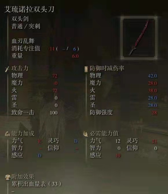 艾琉諾拉雙頭劍(刀)的跳劈模組極為優秀,跳劈輕攻擊有四段打擊,在出血流打法上有著得天獨厚的優勢。在感應只有20的情況下,血質變的兩把雙頭劍能夠在跳劈四段全中的情況下輕鬆打出出血,出血的大硬直可以讓你再次跳劈出血復讀,基本可以曲死95%吃出血的怪同時百分比傷害對很多boss也是極具壓制力,因此泛用性極好。