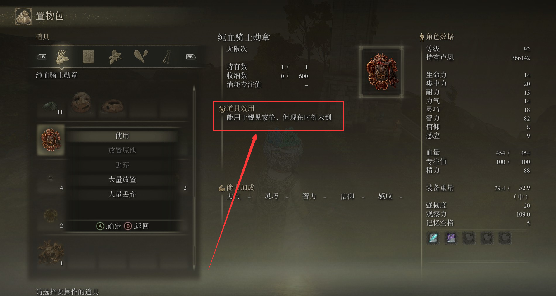 首頁 艾爾登法環 問答 艾爾登法環純血騎士勛章什麼時候用? 2022-08-01 什麼時間都可以用,雖然純血騎士勛章上說【時候未到】,但這個對玩家沒有什麼影響。玩家使用純血騎士勛章能夠傳送至【蒙格溫王朝靈廟】地圖。