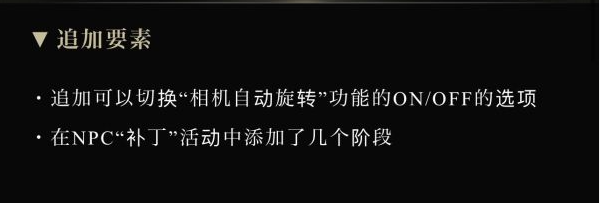 本次更新追加了鏡頭自動切換功能ON/OFF的選項,同時增加了NPC帕奇的支線劇情以及大量的平衡性調整和BUG修復,具體更新內容如下所示。