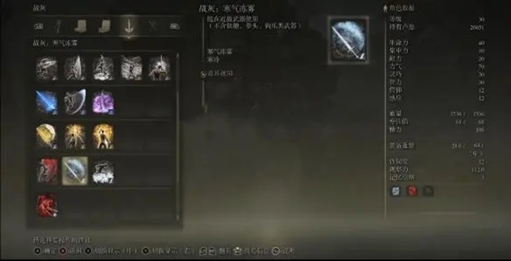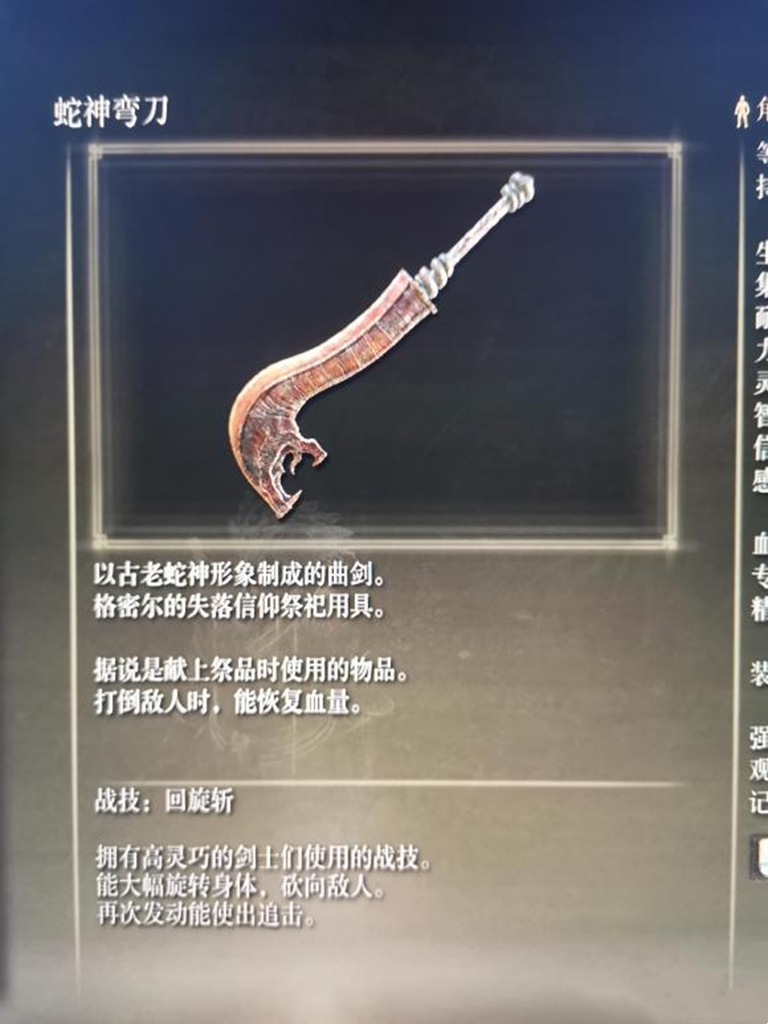 2.右手:蛇神彎刀,攻擊回血,上老寒腿。或者帶活祭品斧,可上老寒腿戰灰,效果是殺敵回藍。