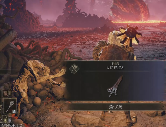 1、剛進boss大蛇的領域時,左手邊有一具屍體,可以獲得一把大蛇擊殺專屬武器大蛇狩獵矛,我們把這個武器裝備上。