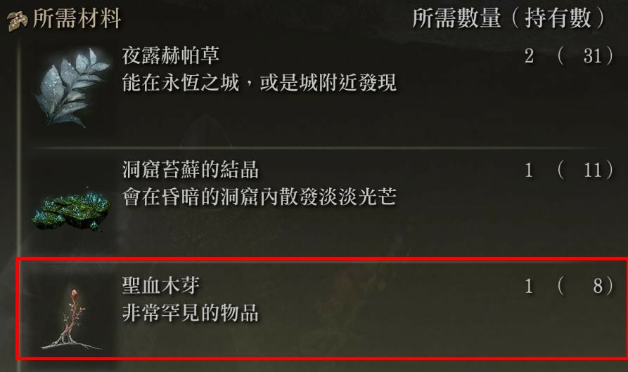 首頁 艾爾登法環 問答 艾爾登法環聖血木芽在哪? 2022-08-03 打開地圖傳送法洛斯要塞,法洛斯要塞篝火,左邊有個紅色的圍牆,往圍牆外面走,是個懸崖,沿著懸崖找一個靈魂氣流再跳下去即可找到聖血木芽。
