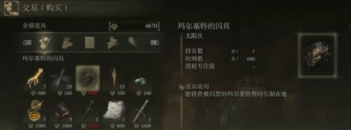 作用是將瑪爾基特暫時壓制在地上,艾爾登法環瑪爾基特的囚具能夠將曾經被囚禁的瑪爾基特暫時壓制在地上,一段時間後就失效。