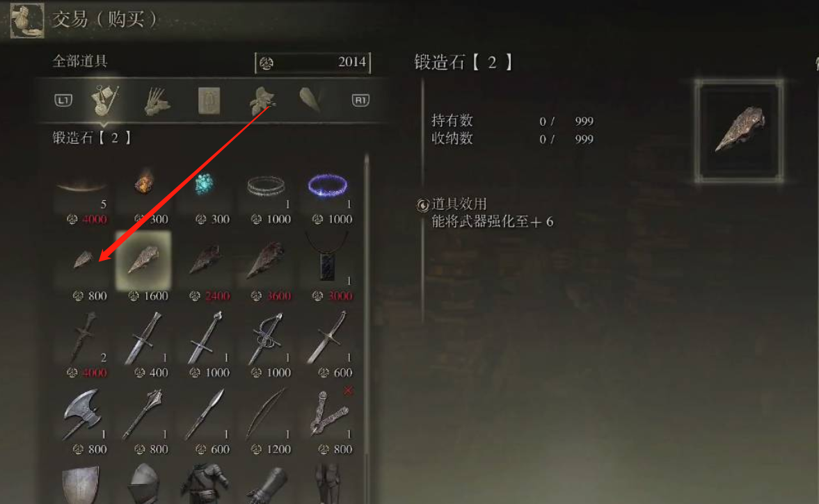 首頁 艾爾登法環 問答 艾爾登法環一級鍛造石在哪買? 2022-08-04 一級鍛造石可以在圓桌廳堂的【孿生老嫗】商人處花800盧恩無限購買。1、我們首先找到大賜福中的孿生老嫗,和她對話後,選擇購買選項。2、在交易界面現在需要的鍛造石購買即可。