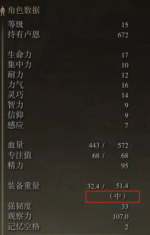 《艾爾登法環》裝備重量是指遊戲中的玩家角色身上穿戴的所有裝備(包括武器欄所有武器)加起來的當前負重值,這個負重值會影響角色的翻滾動作的流程度。低於70%裝備重量上限就比較正常(如下圖裝備重量約是裝備重量上限的63%,屬於中),超過這個值會增加動作消耗讓翻滾的速度變慢。