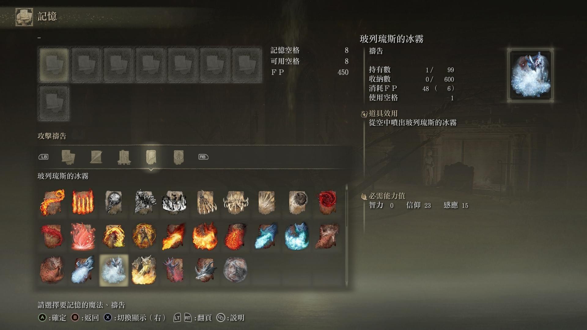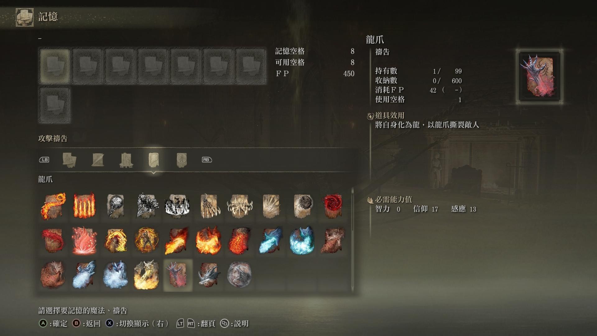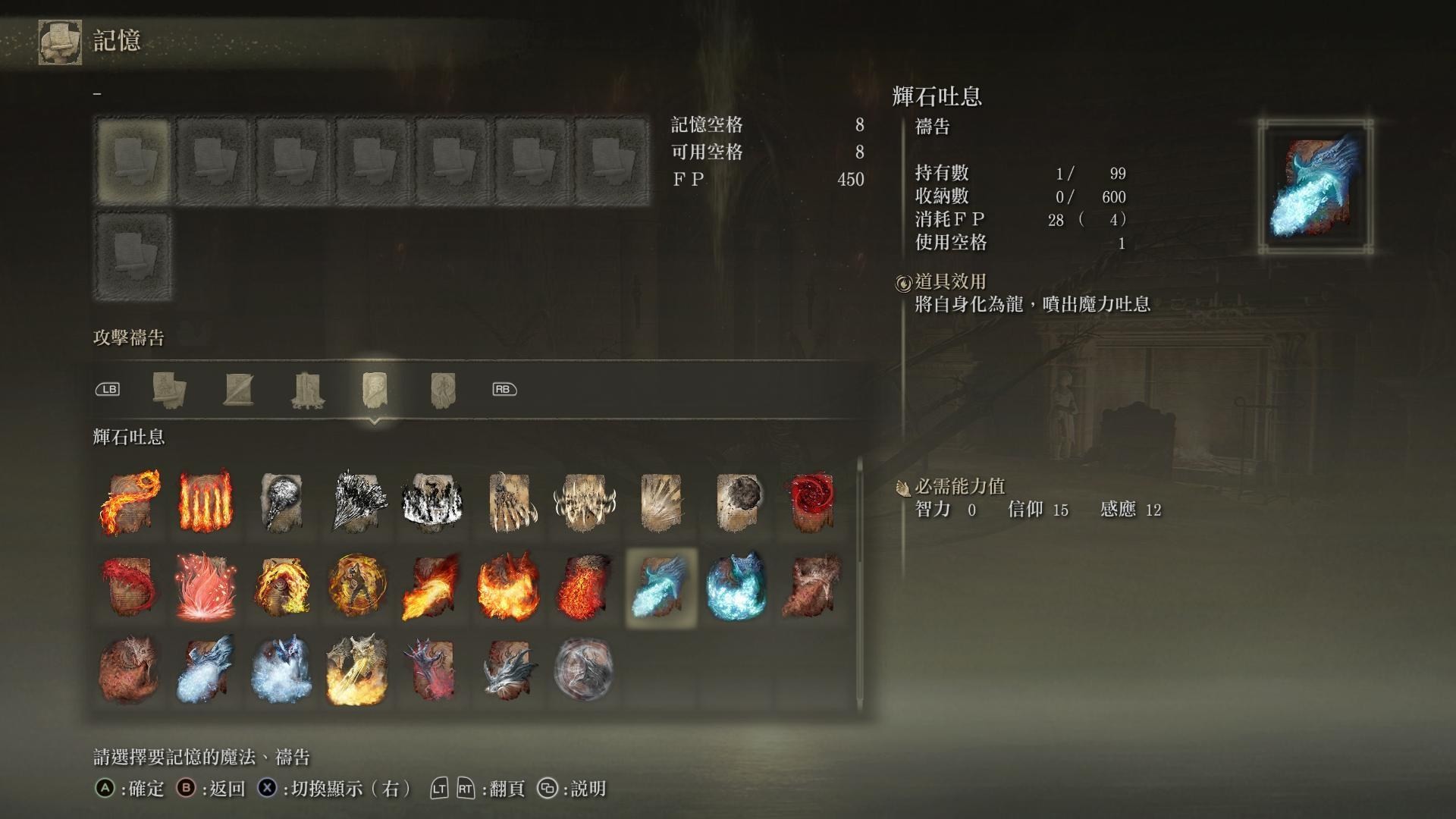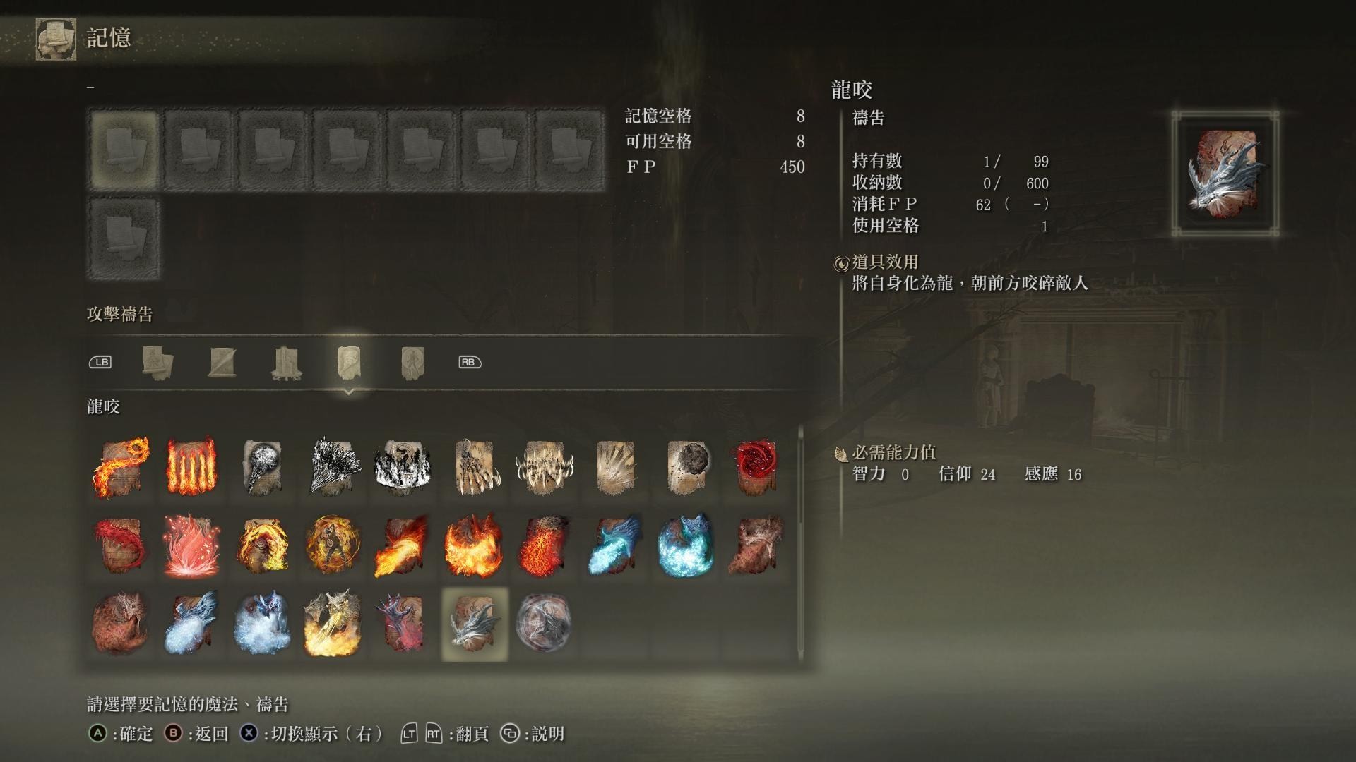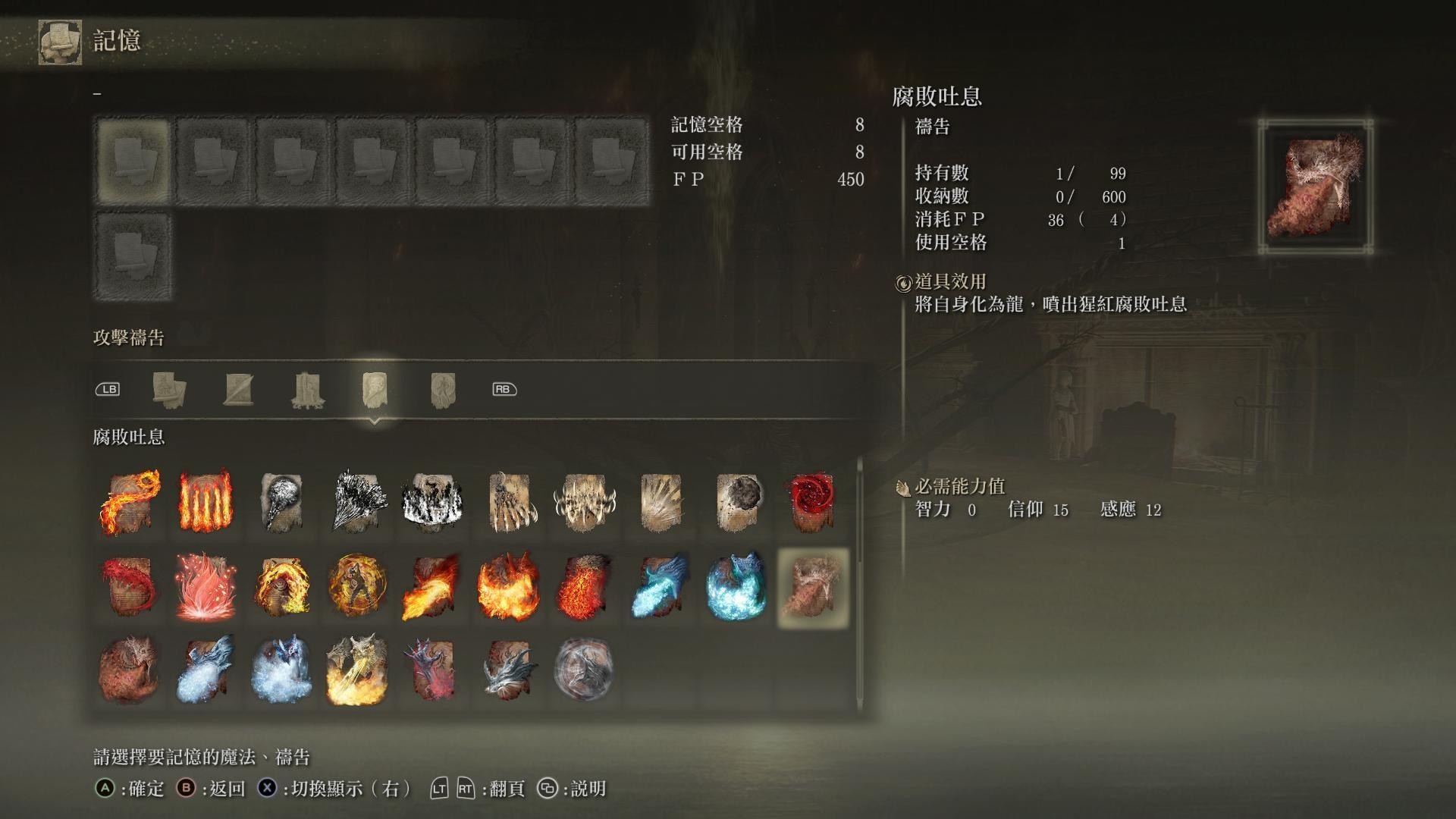 8.龍冰:將自身化身為龍,噴出寒冰吐息(消耗1個龍心臟)。猩紅腐敗吐息,在跳躍期間也能使用。擊敗「步入腐敗」艾格基斯後才能學習(消耗2個龍心臟)。