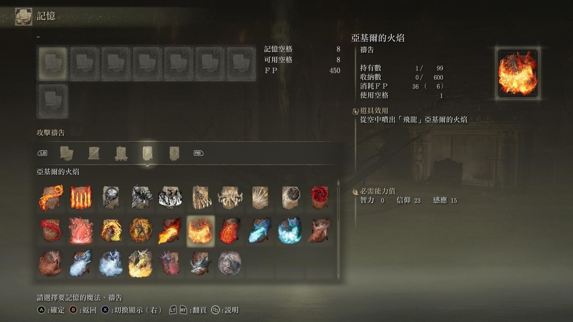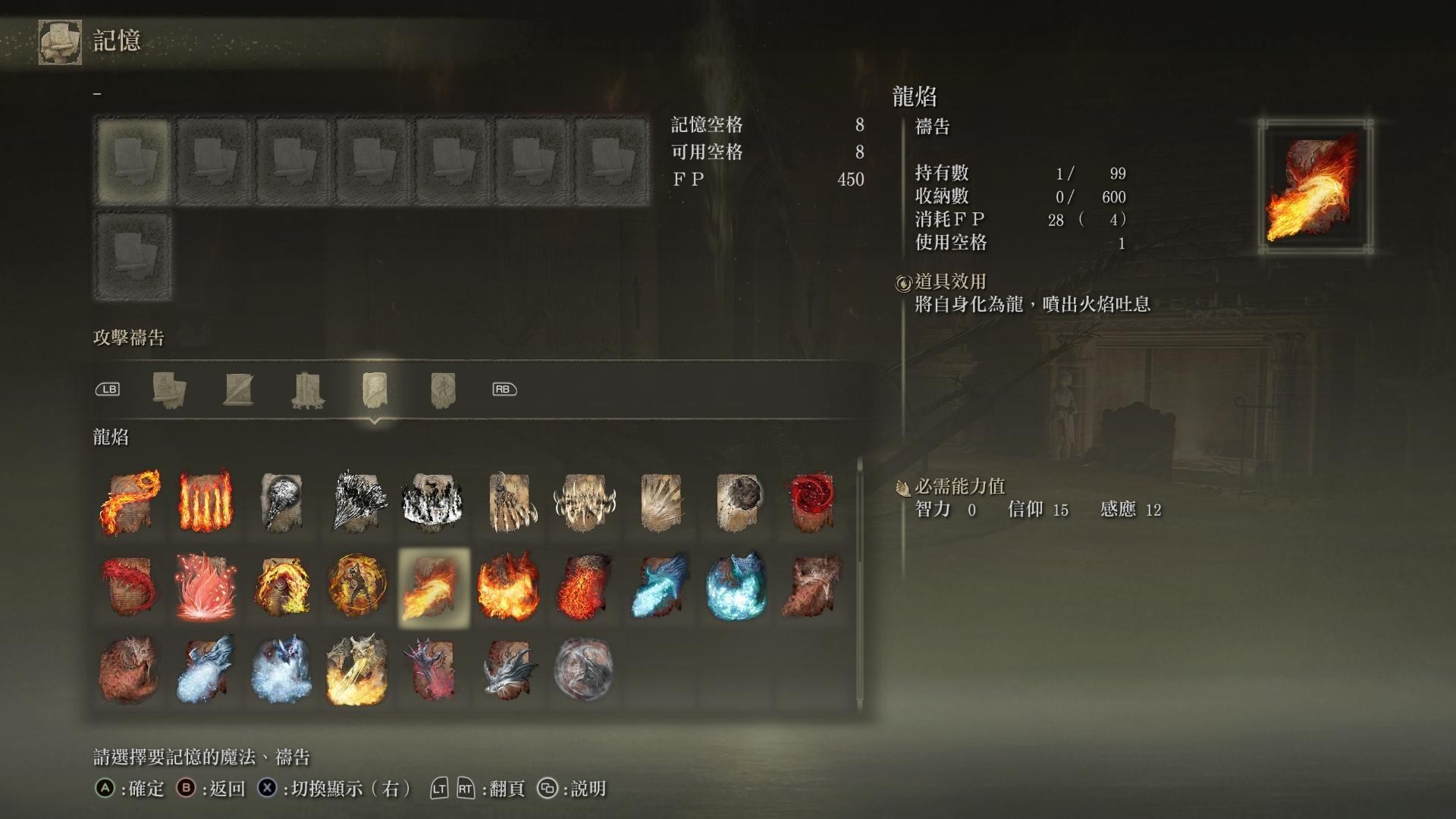 11.亞基爾的火焰:將自身化身為龍,從空中噴出「飛龍」亞基爾的火焰,在跳躍期間也能使用。擊敗「飛龍」亞基爾後才能學習(消耗2個龍心臟)。