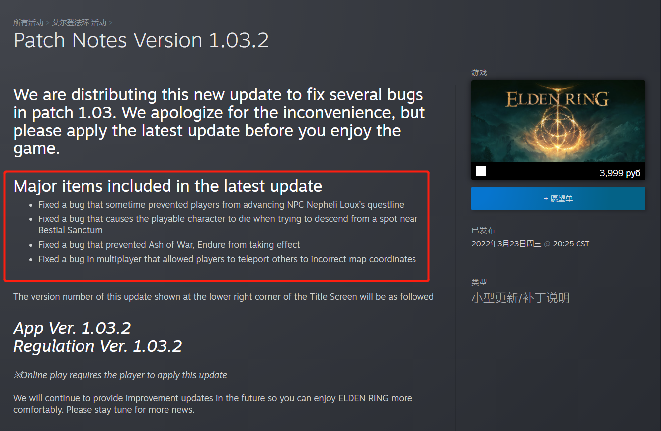 艾爾登法環在3月23日進行了1.03.2的更新,這次更新是一個小型更新,也就是打了個補丁。具體的更新公告在上架了該遊戲的平台中都能看到,此次更新主要是修復了四個玩家在遊戲時發現的bug,並不影響玩家對整個遊戲的進度和體驗,下圖是艾爾登法環的小型更新/補丁說明的公告截圖。