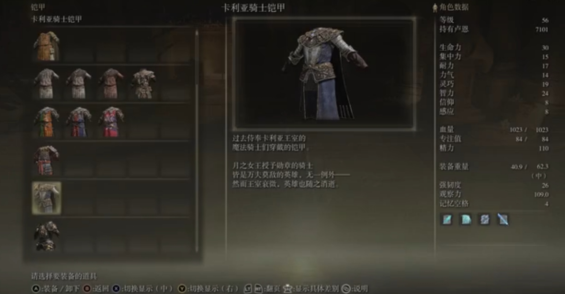 在艾爾登法環遊戲中,卡利亞騎士套裝屬性分別是物理26.5,打擊26.5,斬擊21.5,突刺25,魔法17.3,火19,雷13.2,聖17.3,毒抗/腐爛153,出血/凍傷110,睡眠/發瘋193,死亡122,重量22,以上就是卡利亞騎士套裝屬性。