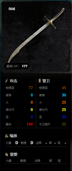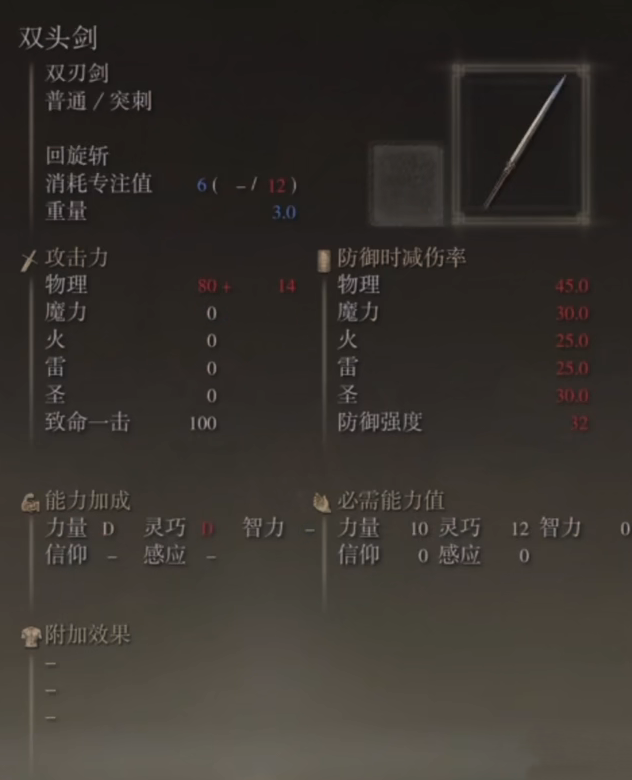 4、雙刃。雙刃是 Elden Ring 中的一種武器(另見雙刃劍),物理層攻擊80,暴擊100。
