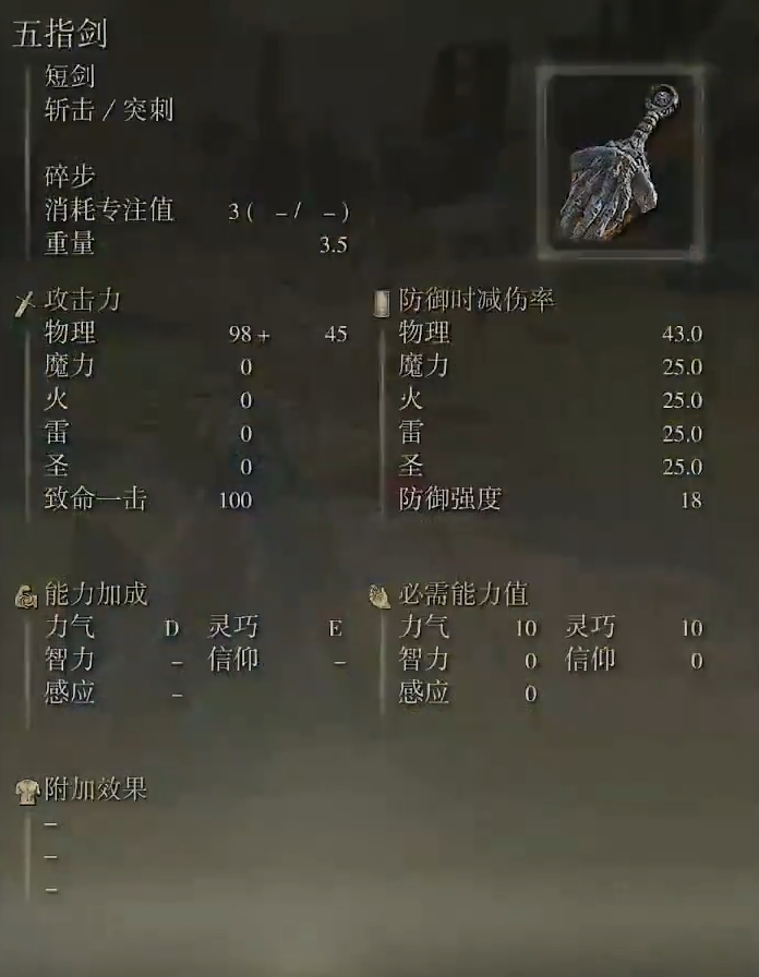 首頁 艾爾登法環 問答 艾爾登法環五指劍好用嗎? 2022-08-04 好用,五指劍擁有的戰技碎步是以速度干擾敵人的戰鬥者們使用的戰技。能以輕盈步伐快速移動。在鎖定目標的狀態下使用,能以目標為中心移動。