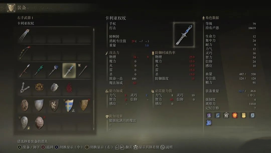 滿月女王的卡利亞法杖需要擊敗2形態的學院boss後獲得她的大盧恩,然後回圓桌兌換獲得,注意卡利亞法杖和月球魔法暫時只能2選1。