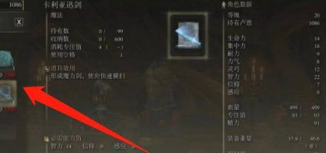 3、最後,在魔法學習頁面中,找到並選擇卡利亞迅劍,即可學習卡利亞迅劍的魔法、效用等相關作用了。