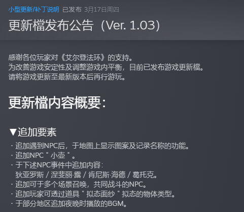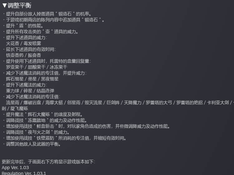首頁 艾爾登法環 問答 艾爾登法環1.03.1更新了什麼? 2022-08-06 1、追加了多項要素,如地圖上顯示npc、多個新的npc和支線、戰鬥場景等。2、修正異常狀況,即遊戲中會出現的一些bug。3、對部分武器、法術、禱告的傷害進行調整,道具的時間和增加的buff值也做出了調整。