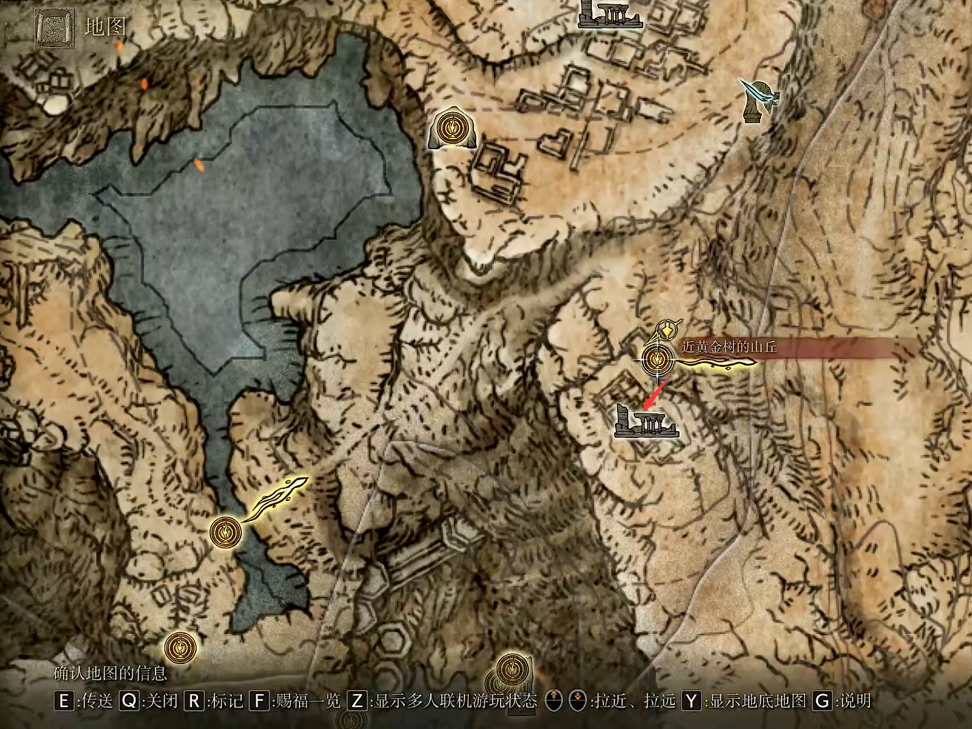 1、艾爾登法環盧克斯廢墟在近黃金樹的山丘南方。我們先傳送到近黃金樹的山丘的篝火點,