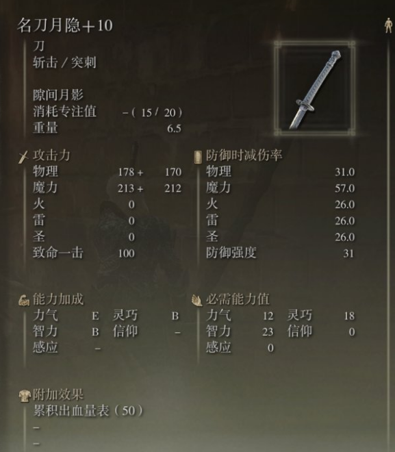 艾爾登法環名刀月隱值得強化,物理攻擊力178 ,魔力攻擊力213 ,防禦減傷率比較高,所以艾爾登法環名刀月隱值得強化。