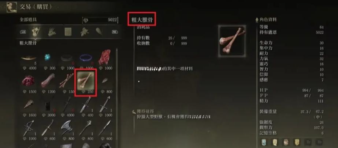 第一步:來到戰者破屋,先在前面賜福消磨時間一直到晚上,等屋裡的npc消失後就會出現玲珠獵人,打敗玲珠獵人後可以獲得商人的玲珠,之後回到圓桌交給商人的孿生老嫗npc就能購買到粗大獸骨。