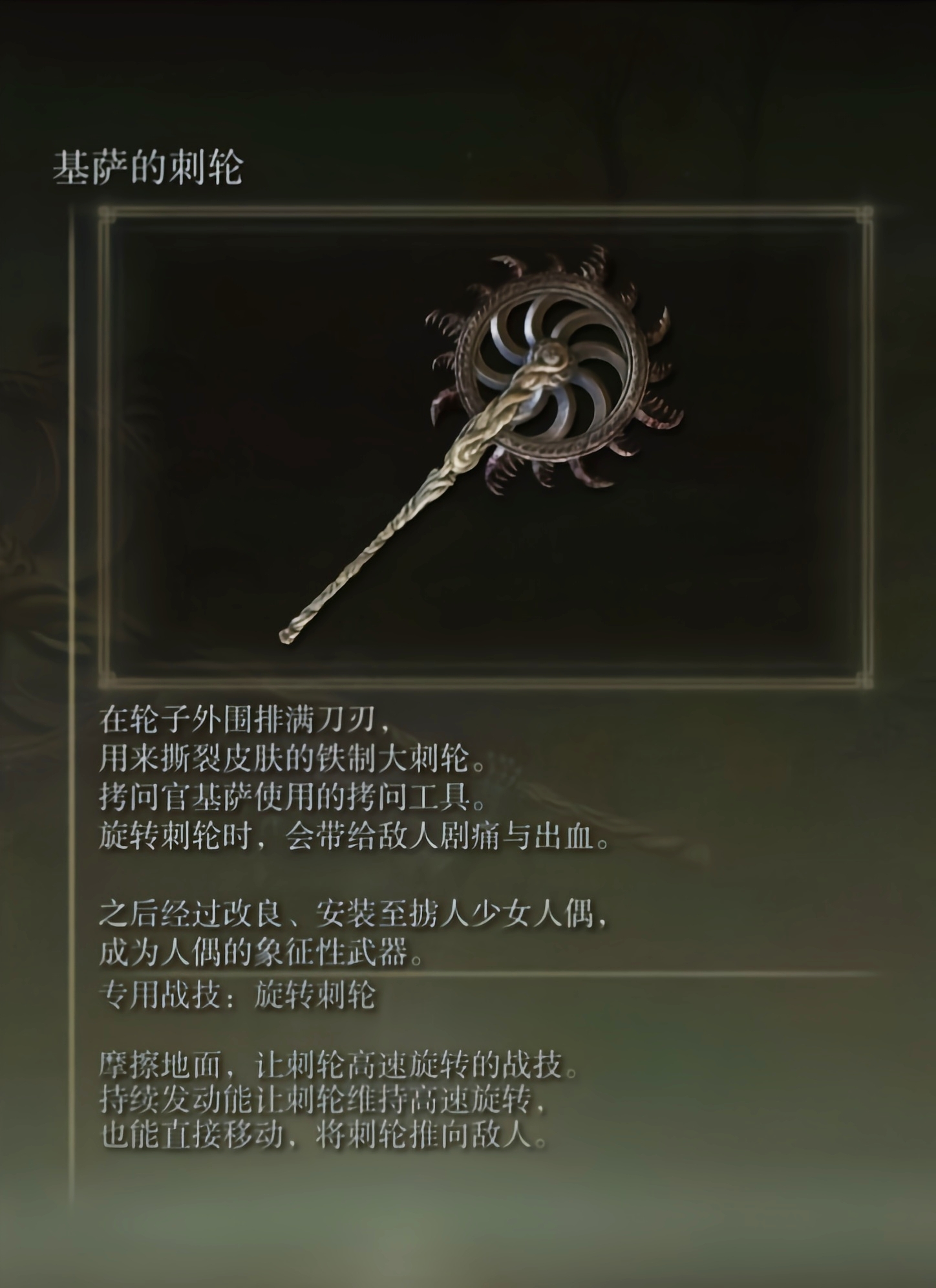 首頁 艾爾登法環 問答 艾爾登法環基薩的刺輪怎麼用? 2022-08-06 武器技能名稱為「旋轉刺輪」,類似電鋸的概念,通過不斷旋轉刺輪來累積出血量,通過摩擦地面,來持續發動刺輪的動能,達到高速旋轉,當刺輪推向敵人時,會直接給敵人帶來出血和劇痛。