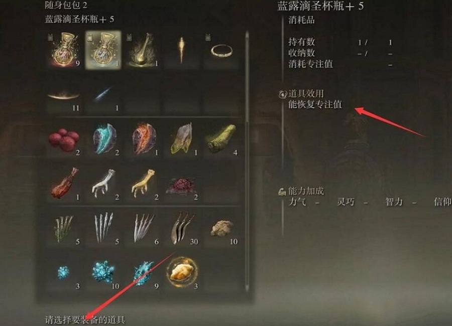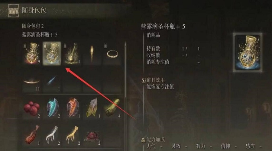 首頁 艾爾登法環 問答 艾爾登法環無限藍露滴怎麼用? 2022-08-07 艾爾登法環藍露滴聖杯瓶使用方法:1.進入遊戲,點擊打開背包頁面。2.進入背包中找到藍露滴聖杯瓶。3.點擊左下角的使用可以增加藍條。