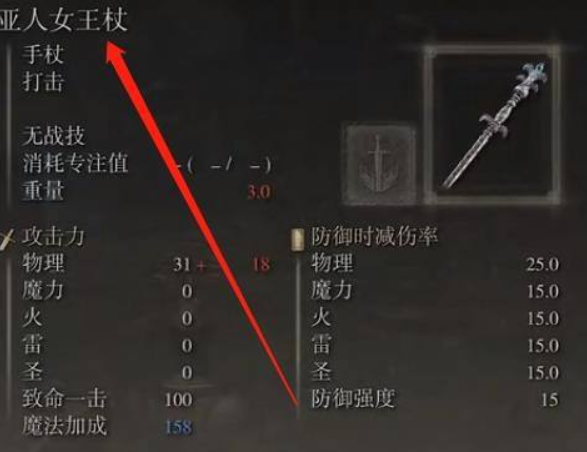 首頁 艾爾登法環 問答 艾爾登法環亞人女王權杖怎麼樣? 2022-08-07 亞人女王杖的智力需求只要10點,就算是一些低智力職業也能很快帶上,前期有需要的話可以拿來過度用用,在絕大多數場合下都是法師可選擇的畢業法杖之一,詳細屬性如下圖所示。