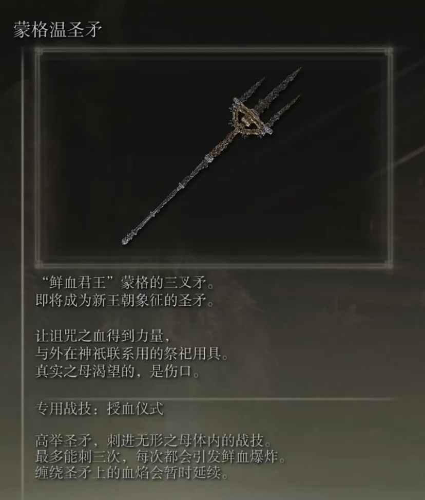 自帶出血,而且有一個很好用的戰技。戰技,授血儀式:360℃大範圍aoe,戰技總共有三段,只需要讀一段,就可以給武器上血焰狀態。重點是還有超強的削韌!!巨人墓碑處測試,兩段戰技就可以讓雪巨人跪下。總結來說就是出血 血焰 削韌戰技 高傷害,