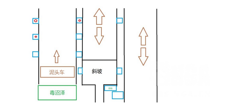 3、在第三個安全區右邊可以直接跳下去到第二條通道,建議在泥頭車向上開的時候跳下去然後直接跑到第二條通道斜坡下面中間—條橋的邊上跳下去,這里有一個台階。