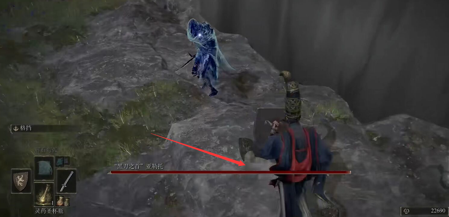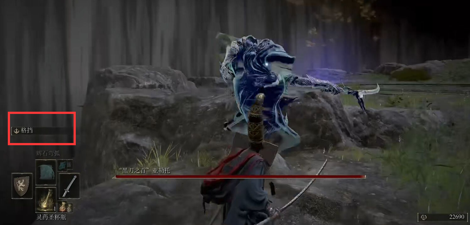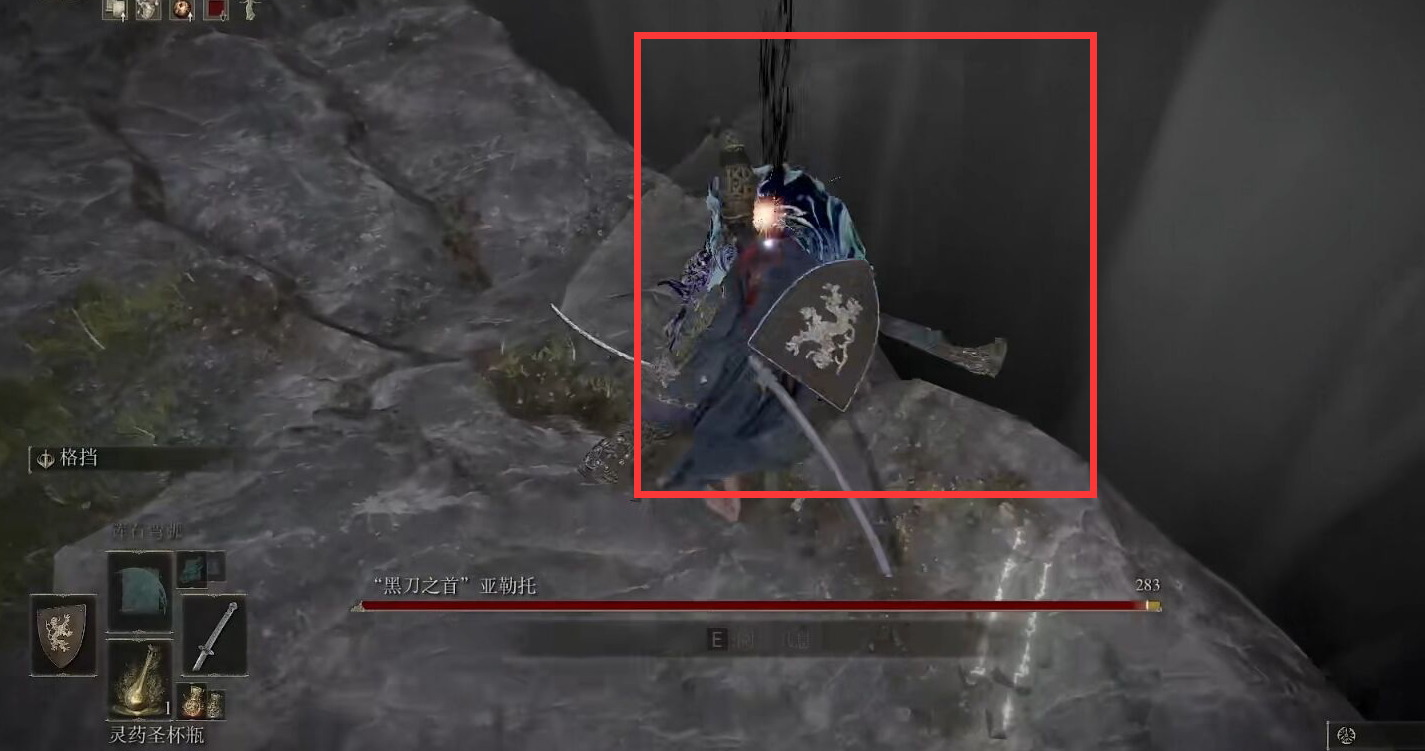 4、待他發現我們沖過來時往後退一下,格擋。