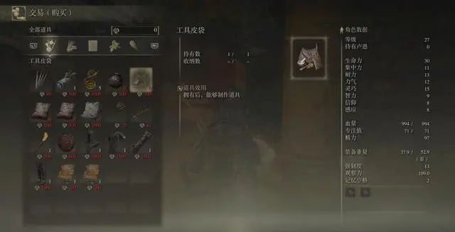首頁 艾爾登法環 問答 艾爾登法環怎麼做道具? 2022-08-09 1、先到達艾雷教堂。2、在這里跟一個流浪商人對話並進行交易購買工具皮袋。3、得到工具皮袋後,點擊遊戲主菜單製作道具,即可根據配方花費對應素材製作道具。