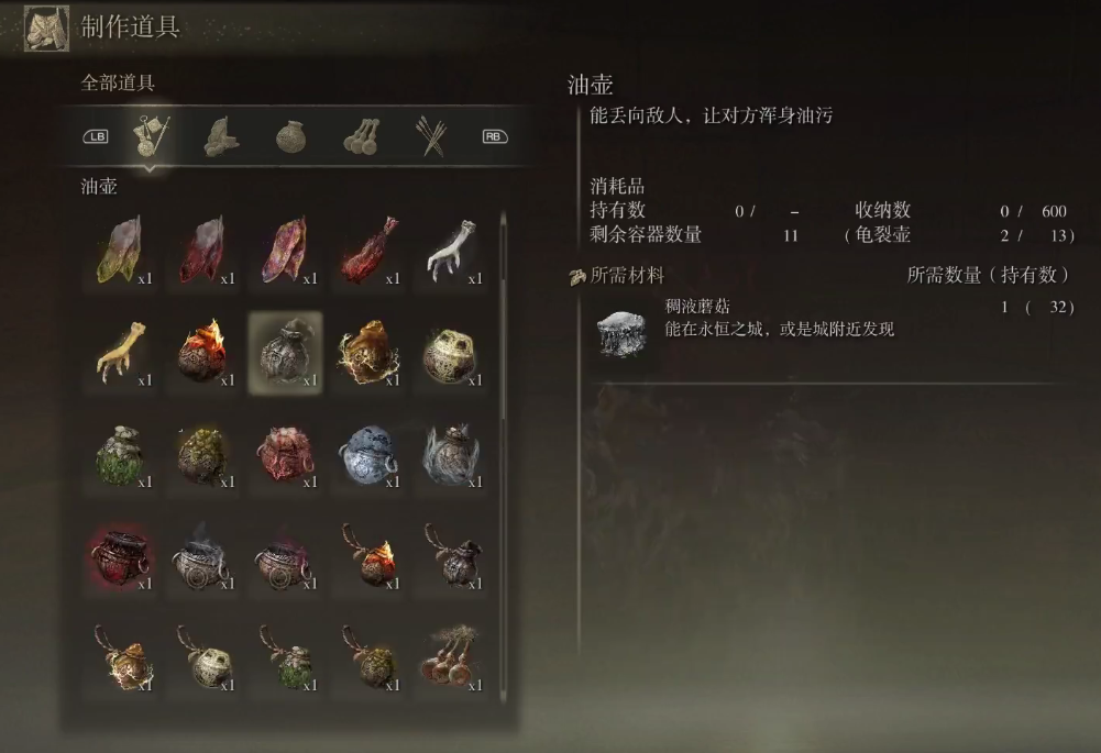 艾爾登法環中油壺製作是需要解鎖的,解鎖後才能製作。具體流程如下: