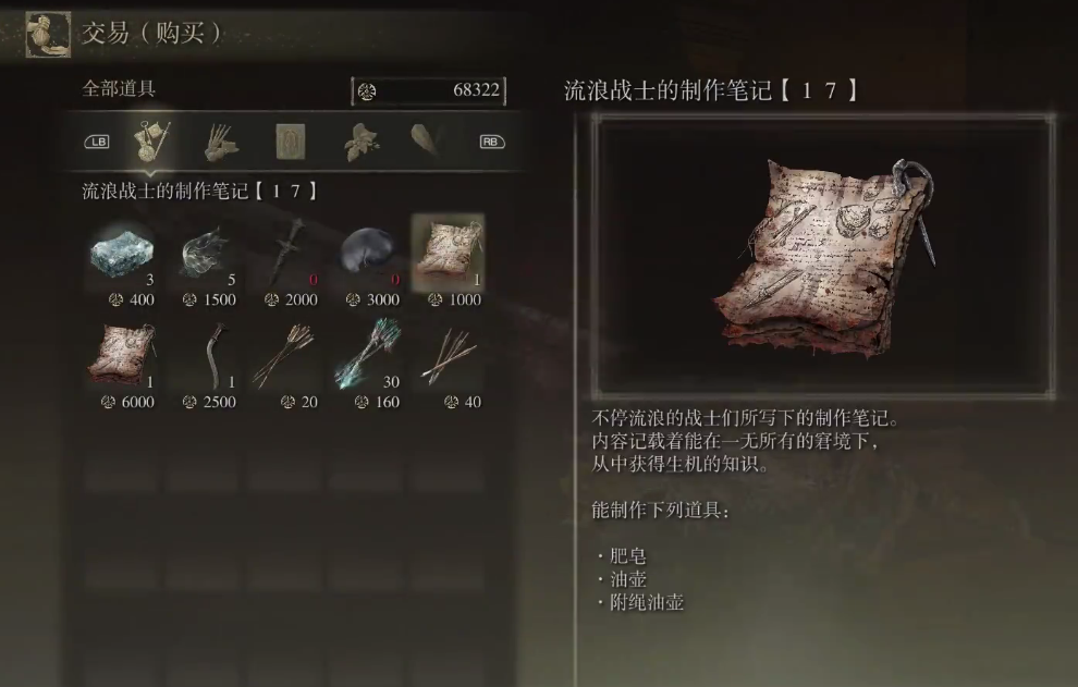 2.在購買界面找到流浪戰士的製作筆記17,這是解鎖製作油壺的必要道具。