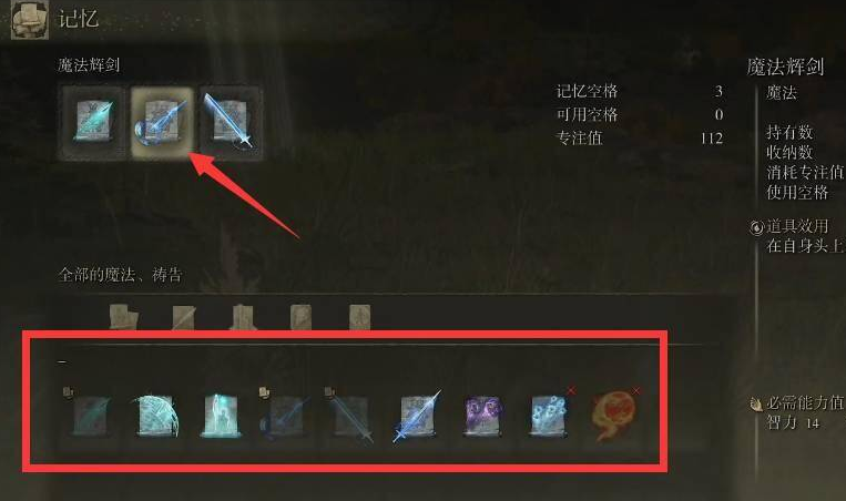 2、將物品欄里需要更換的魔法,拖拽至上方的三個記憶空格里,就可以更換魔法。