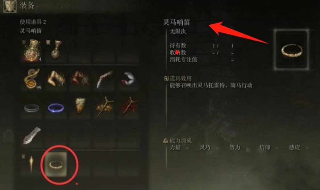 1、登錄艾爾登法環遊戲,進入任務,見過梅琳娜後,獲得靈馬哨笛。打開裝備欄,裝備上靈馬哨笛。