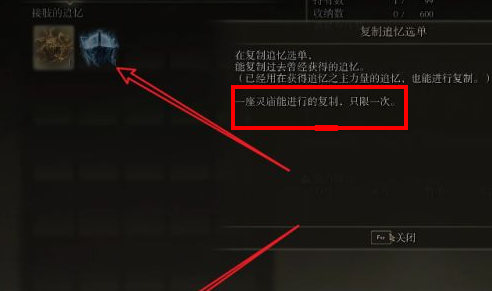 首頁 艾爾登法環 問答 艾爾登法環追憶能復制幾次? 2022-08-12 艾爾登法環追憶只能復制一次1.首先進入遊戲以後找到下圖所示的靈廟2.然後進入靈廟走到中間的那個位置,如下圖所示3.選擇要復制的追憶,點擊確定即可以復制,如下圖所示4.從上圖可知 艾爾登法環追憶只能復制一次