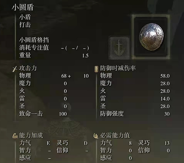 1、小圓盾,在遊戲中的所有盾牌中擁有最快的格擋速度,這使得它比其它盾牌更容易格擋,而且彈反成功有硬直效果。