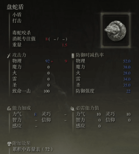 2、盤蛇盾,有【毒蛇咬殺】的戰技:將盾牌上的毒蛇放出對敵人造成中毒效果,大樹守衛咬兩下就可以中毒慢慢熬死,這招攻擊技能遠傷害也比較可觀。