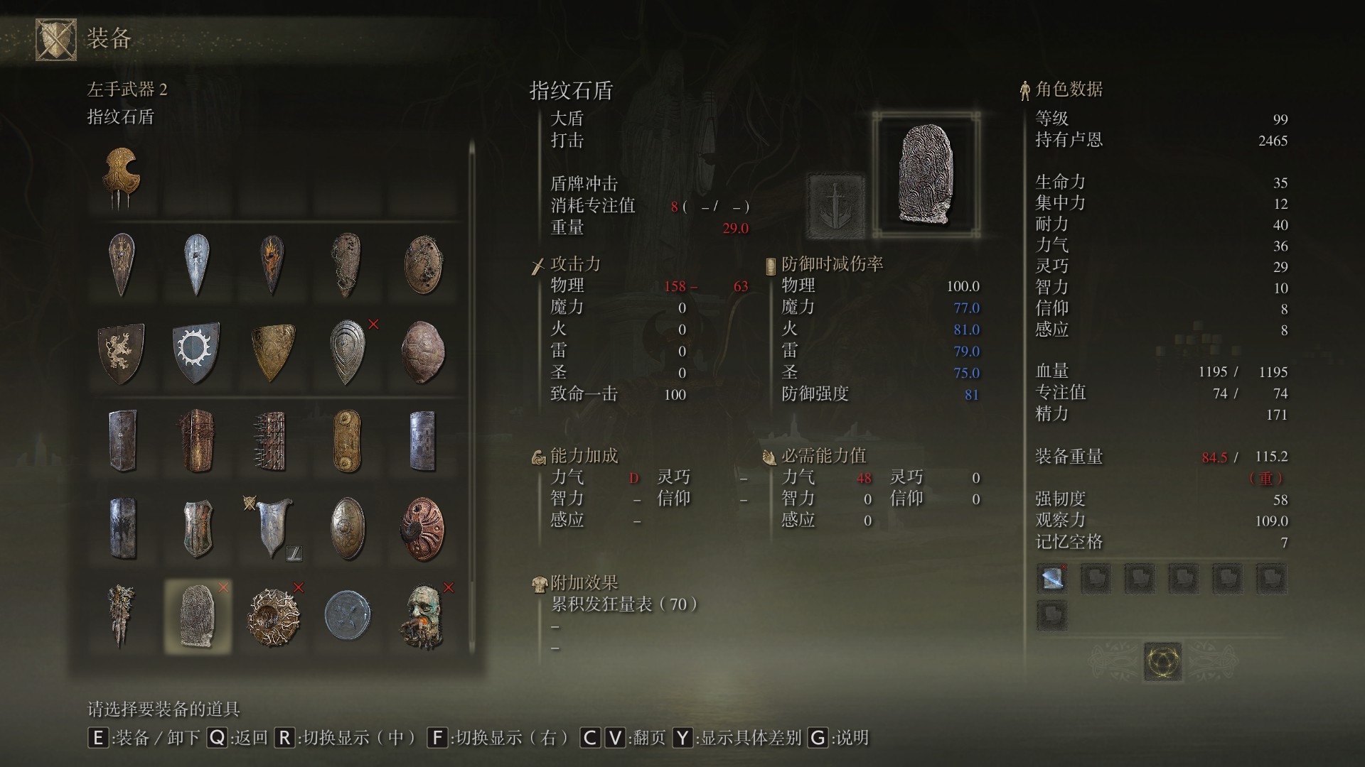 首頁 艾爾登法環 問答 艾爾登法環指紋石盾屬性是什麼? 2022-08-12 初始防禦強度為 81,滿強化後為 90,加上飾品「大盾護符」後剛好可以達到 100% 防禦強度,撐起大盾即可無視一切物理傷害。