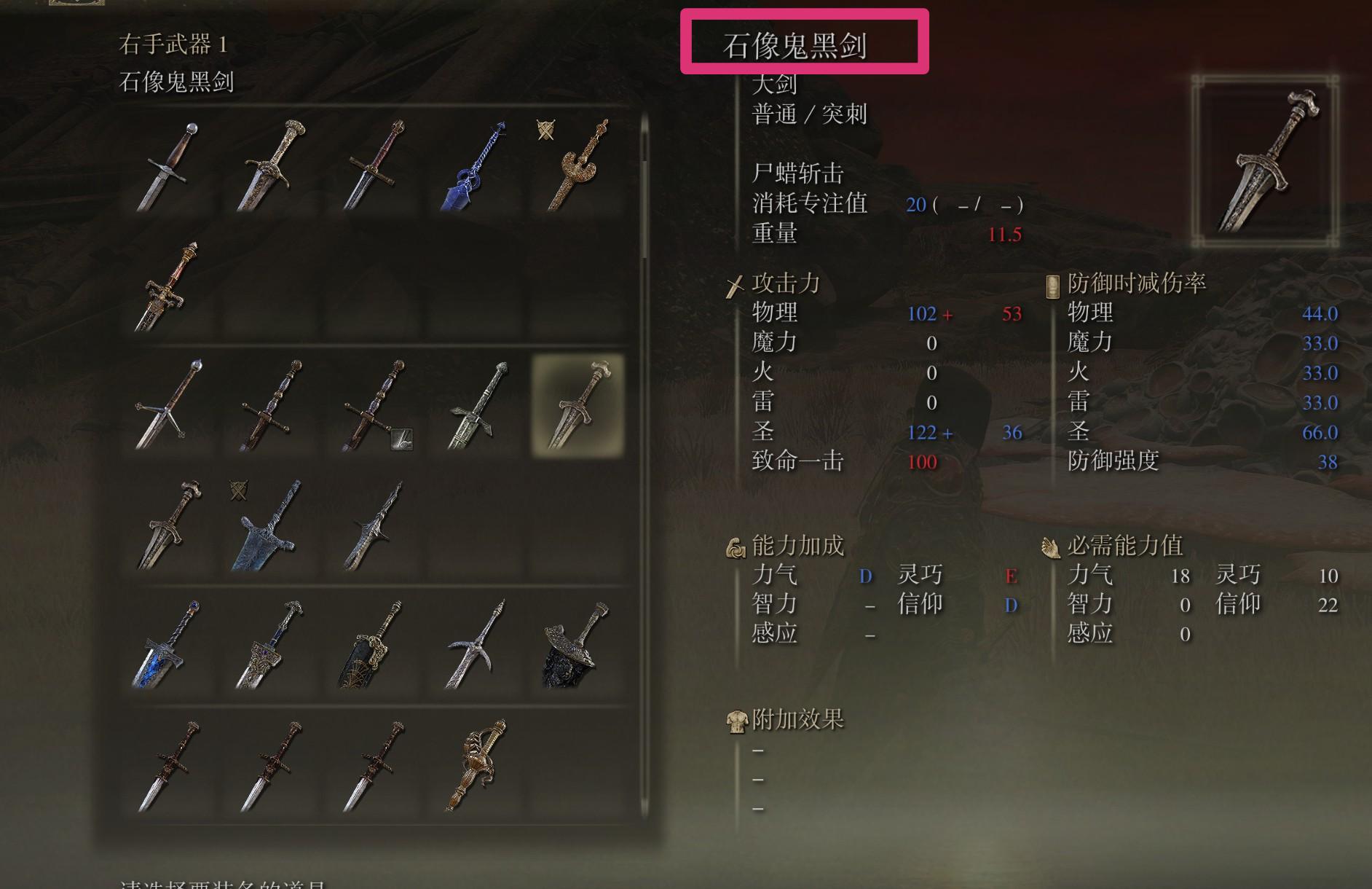 首頁 艾爾登法環 問答 艾爾登法環石像鬼黑劍好用嗎? 2022-08-13 不怎麼好用,無功無過,戰跡屍蠟打擊小怪就掉一絲血。專用戰技:屍蠟斬擊,古英雄們的失傳戰技。高舉劍身,解放屍蠟的力量,將力量化為刀刃,朝前方釋放。