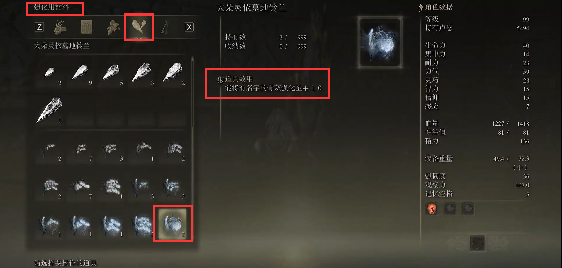 首頁 艾爾登法環 問答 老頭環大朵靈依墓地鈴蘭怎麼用? 2022-08-14 1.首先打開置物包。2.然後在強化用材料選項中找到大朵靈依墓地鈴蘭,點擊使用即可,這個物品的作用的將有名字的骨灰強化至加十。