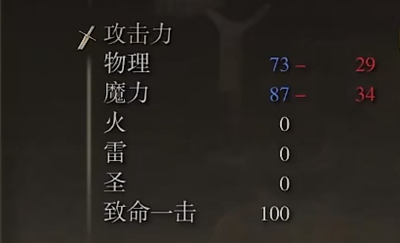 物理:73- 29魔力:87- 34火:0雷:0聖:0致命一擊:100魔法加成:0