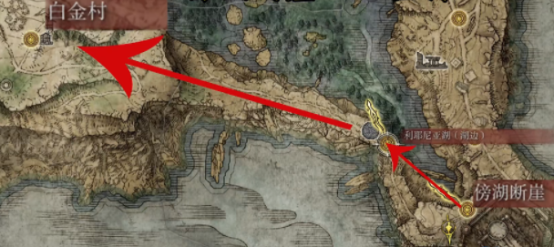 艾爾登法環白金村就在月之祭壇的下方,地圖在利耶妮亞地區,玩家可以按照上圖路線前往白金村,玩家傳送到白金村賜福點,右上方高處走,房子旁邊有一個罐子,玩家可以選擇翻滾碰它一下(攻擊就可以,避免傷害太高殺死他),然後回出來一個老爺爺,對話後獲得符節。