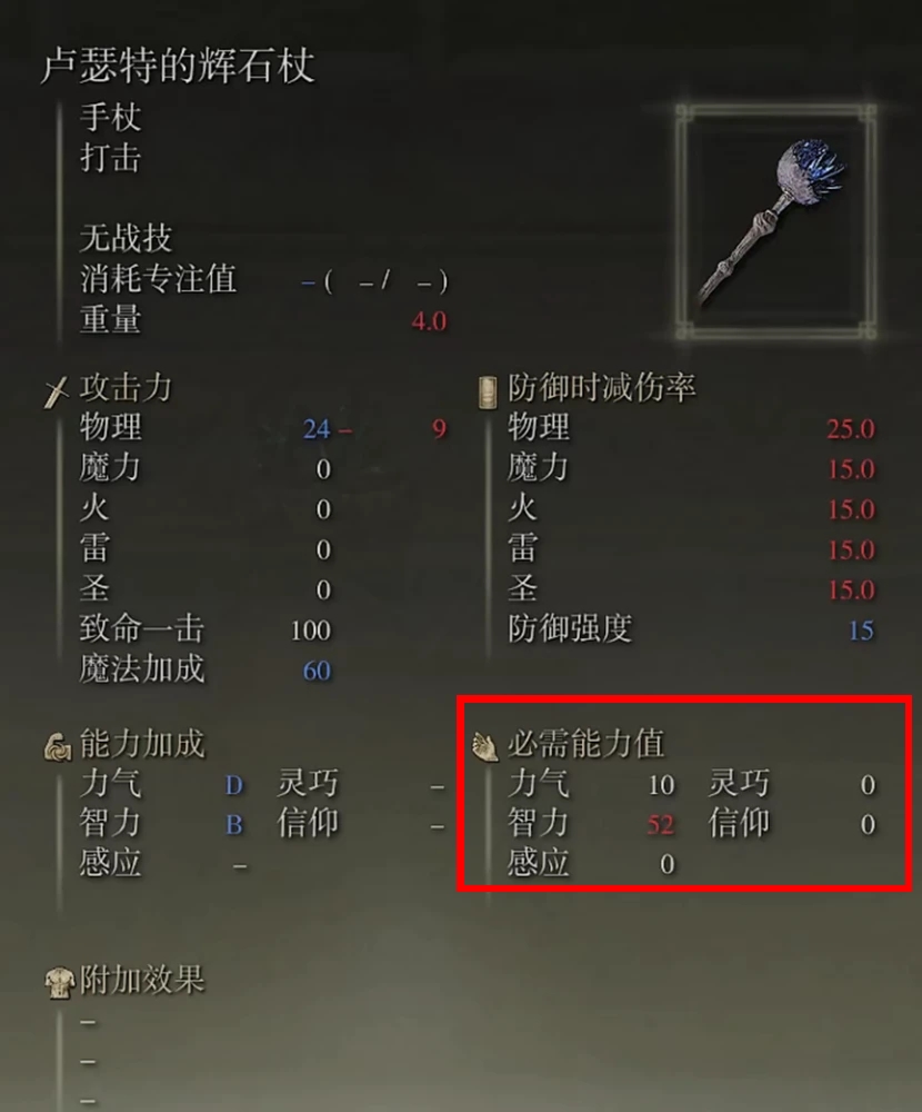首頁 艾爾登法環 問答 艾爾登法環戰士怎麼用法杖? 2022-08-15 法杖是施展魔法的觸媒,首先要去賜福記憶法術,把魔法裝上,然後滿足法杖和法術的能力需求值,即可使用法杖,附圖盧瑟特的輝石杖的能力需求:智力52、力氣10,所以戰士要使用法杖要多加點智力屬性。