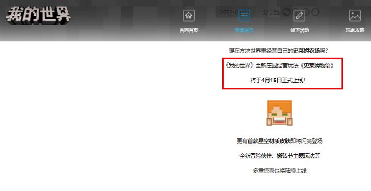 我的世界網易版官網發布公告,全新莊園經營玩法《史萊姆物語》將會上線,日期是4月15日,因此就是這一天更新。