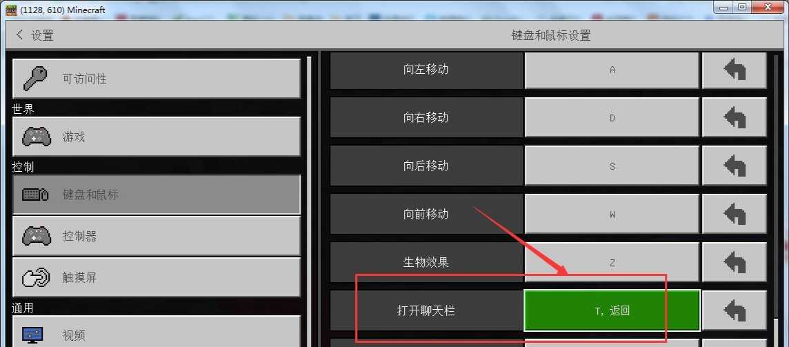 首頁 我的世界 問答 我的世界怎麼打字? 2022-08-17 1、玩家進入遊戲後按「ESC」鍵退出,點擊「設置」選項,如下圖所示:2、點擊「鍵盤和滑鼠」選項,如下圖所示:3、按住鍵盤上的「T返回」鍵即可打開聊天框了,如下圖所示: